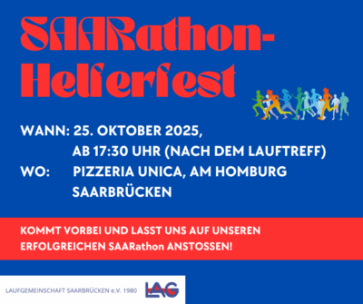 Ohne unsere vielen Helfer wäre der SAARathon 2025 nicht möglich – deshalb möchten wir uns bei allen unseren Helferinnen und Helfern ganz herzlich bedanken! Als kleines Dankeschön laden wir euch ein zu unserem Helferfest am 📅 Samstag, 25. Oktober 2025🕠 ab 17:30 Uhr (im Anschluss an den Lauftreff)📍 Pizzeria UNICA, Am Homburg 47, Saarbrücken Eine […]