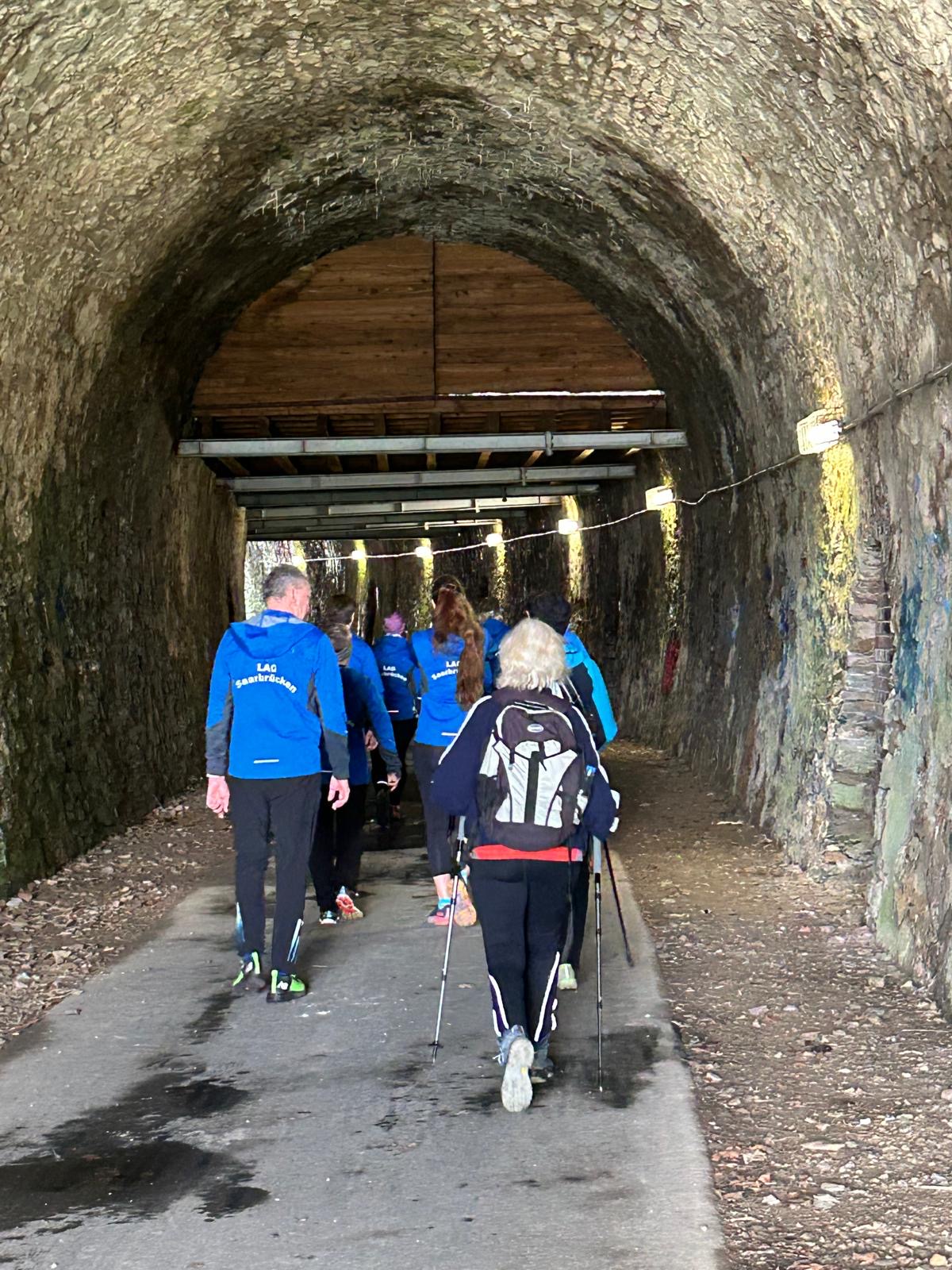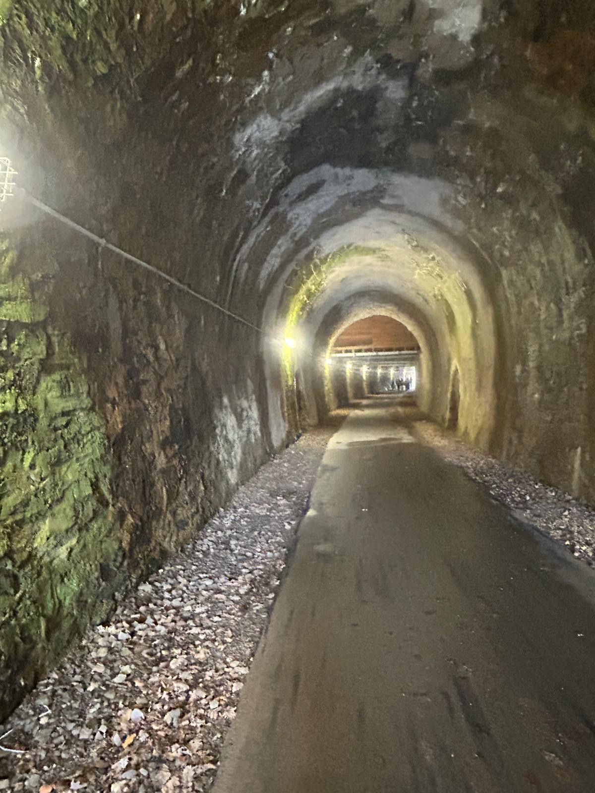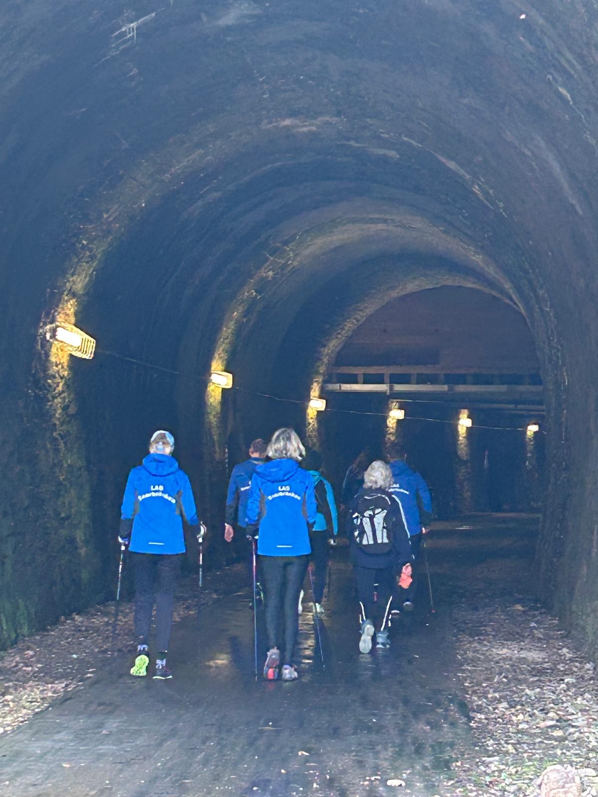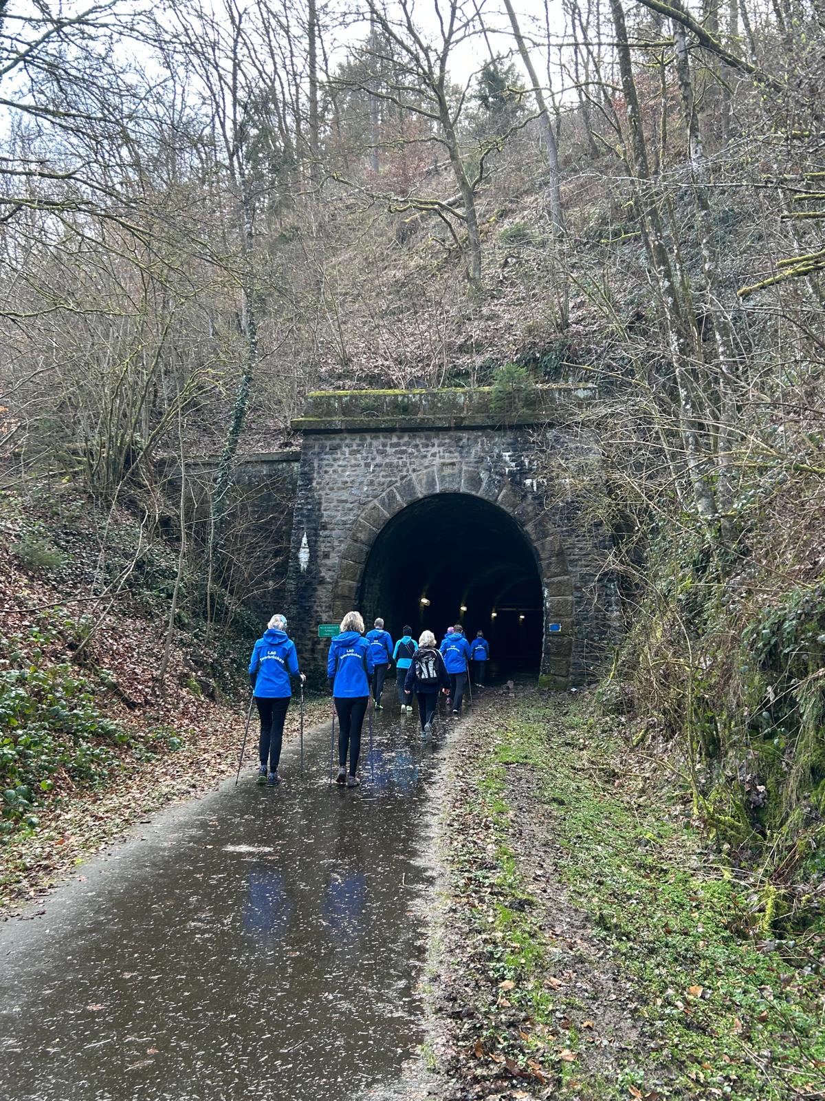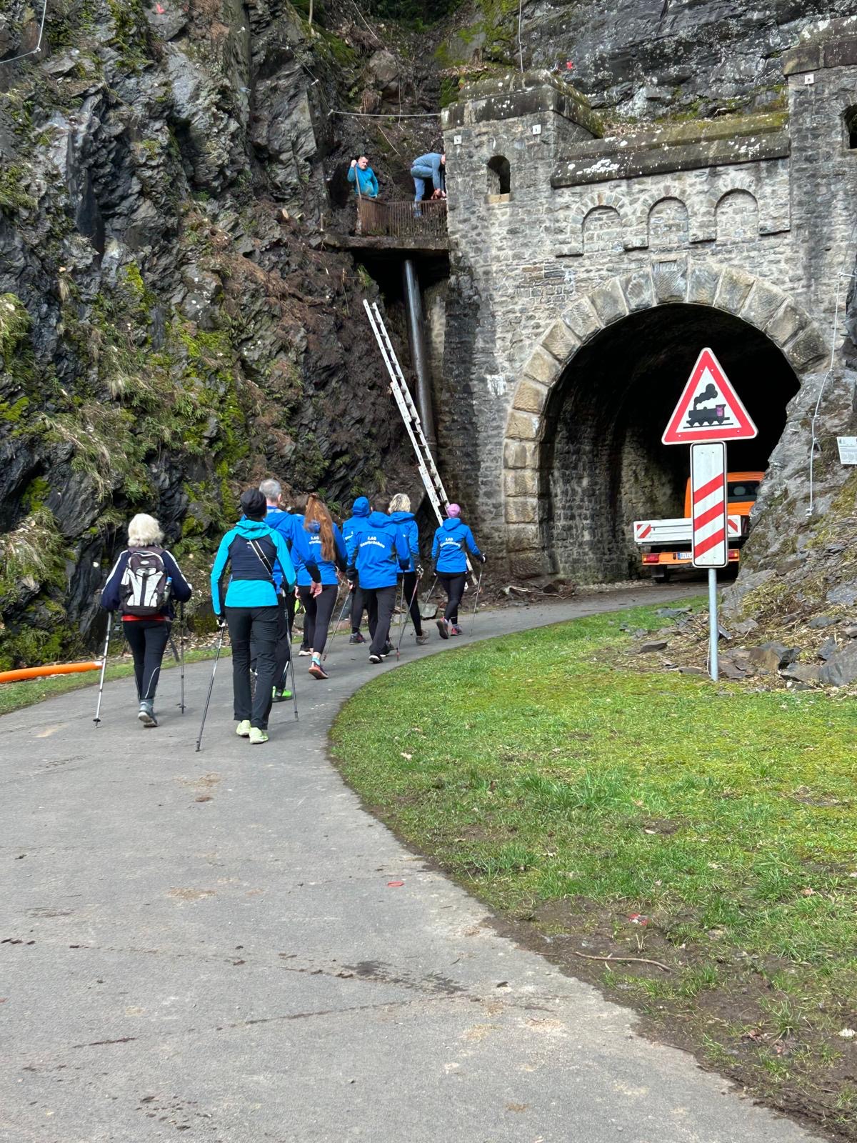 Wer es flacher mochte, fand auf der hervorragend ausgebauten ehemaligen Bahntrasse ideale Bedingungen. Sie ist über einen eindrucksvoll beleuchteten Tunnel erreichbar und bietet gleichmäßige Streckenführung durch die Landschaft. Auch unsere Walker und Wanderer nutzten die vielfältigen Wege – ergänzt durch gezielte Dehn-, Mobilisations- und Mobilityübungen angeleitet von Beatrice unterwegs. Selbst unser Radfahrer Eckhard kam auf seine Kosten und erkundete die Gegend auf ausgedehnten Touren.